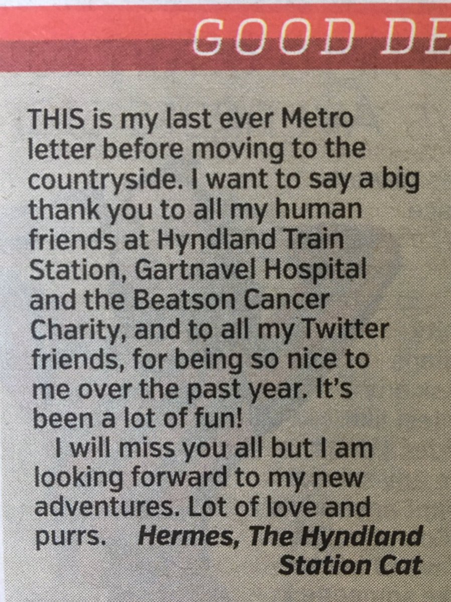 @MetroUKNews, showing my heartfelt thanks to those who use, and work for,@Beatson_Charity,@ScotRail and@NHSGGC. Thanks for being my friends! I will be back on Twitter later today with more#HermesHighlights !
