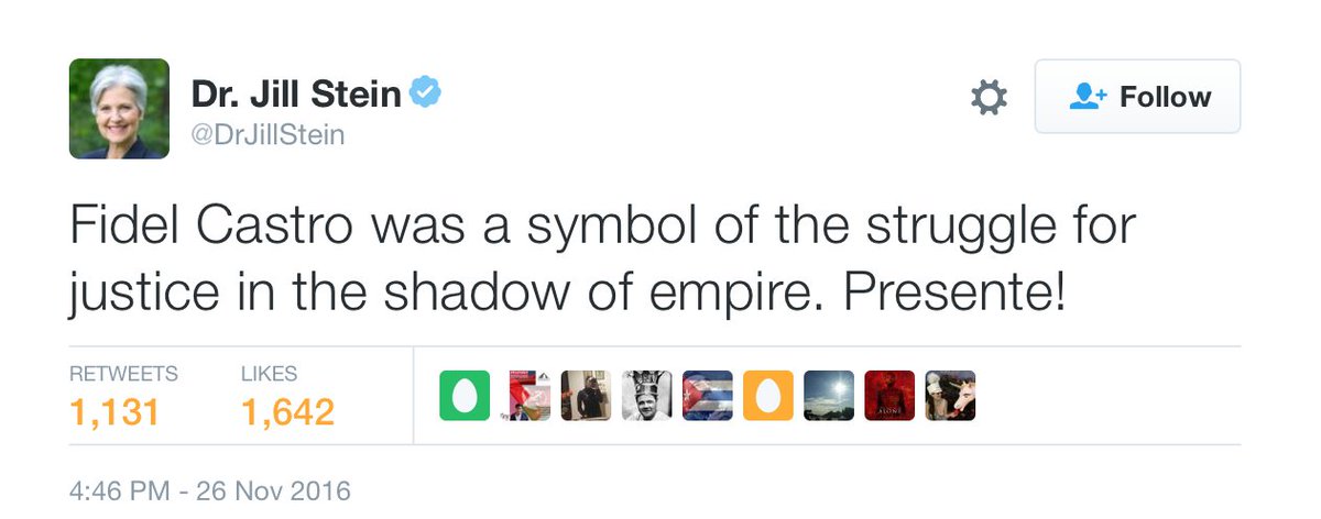 @ginanotjenna@Pamela_Moore13@DrJillStein Sure is. Did you see her praise for Castro today as a "symbol of Justice?" -
