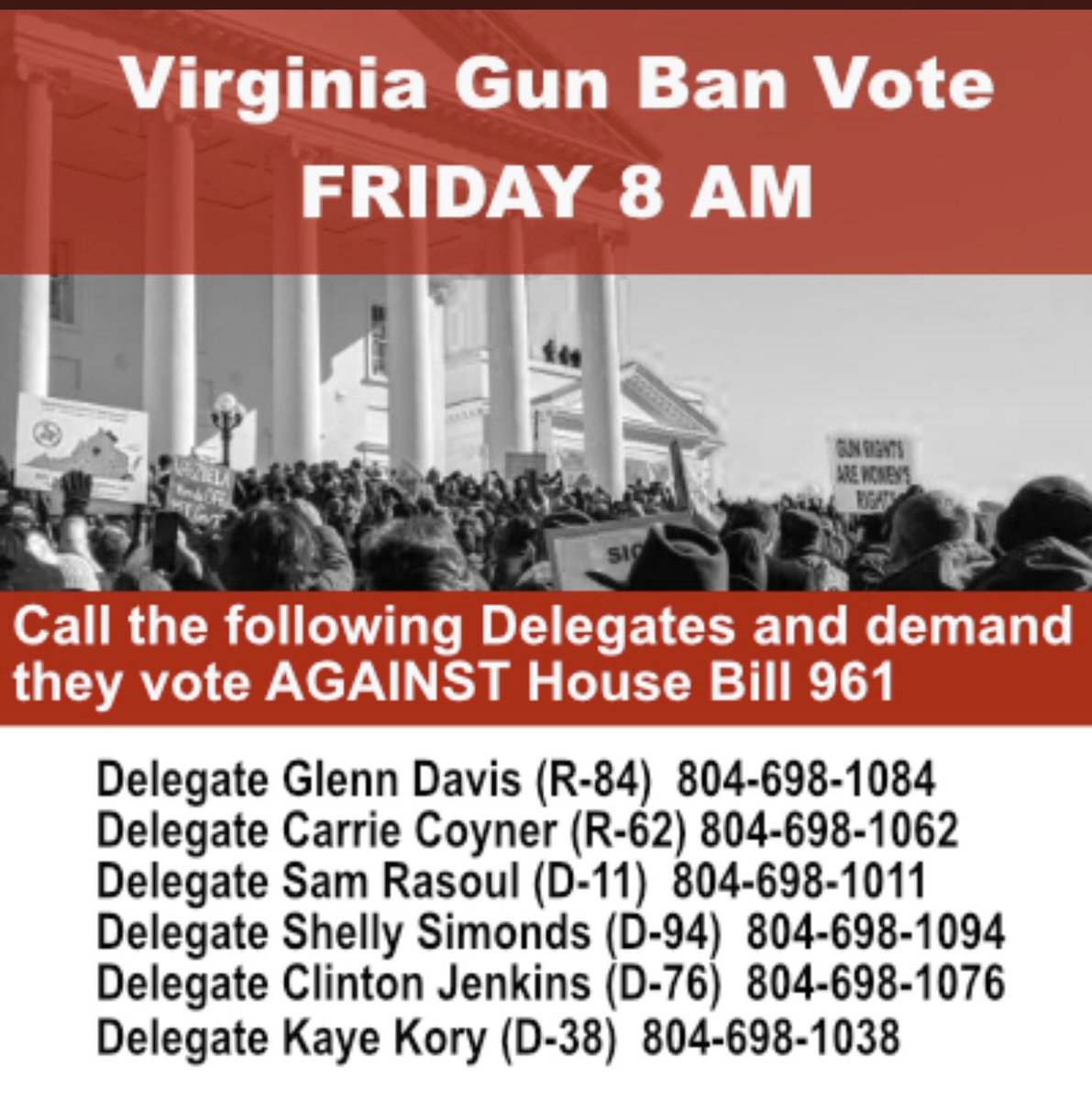 HB 961 will be up for a vote on Friday, Feb. 7 at 8am. This is the bill that will ban most semi auto weapons! Please call the following delegates and demand that they vote NO on this unconstitutional law! #FightForFreedom#2ndAmendmentpic.twitter.com/zQrc1FHMO5