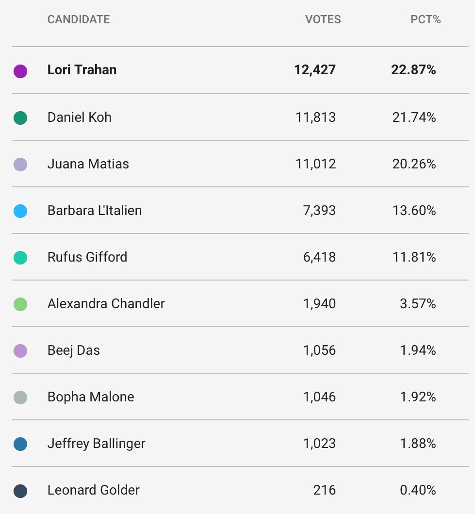 I'm guessing Matias's bump is from Lawrence coming in, but I'm not sure… It's credible to think Koh could win while coming in second in a ton of precincts due to the regionality of other candidates' support.