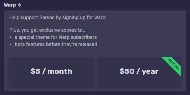 You can now help support Parsec directly by donating to the cause through Warp! When you sign into your profile you'll see this box on your page that'll let you start donating today and receive some cool little rewards for doing so! Link: https://ui.parsecgaming.com/settings/account#warp …pic.twitter.com/lw4a8qb7TU