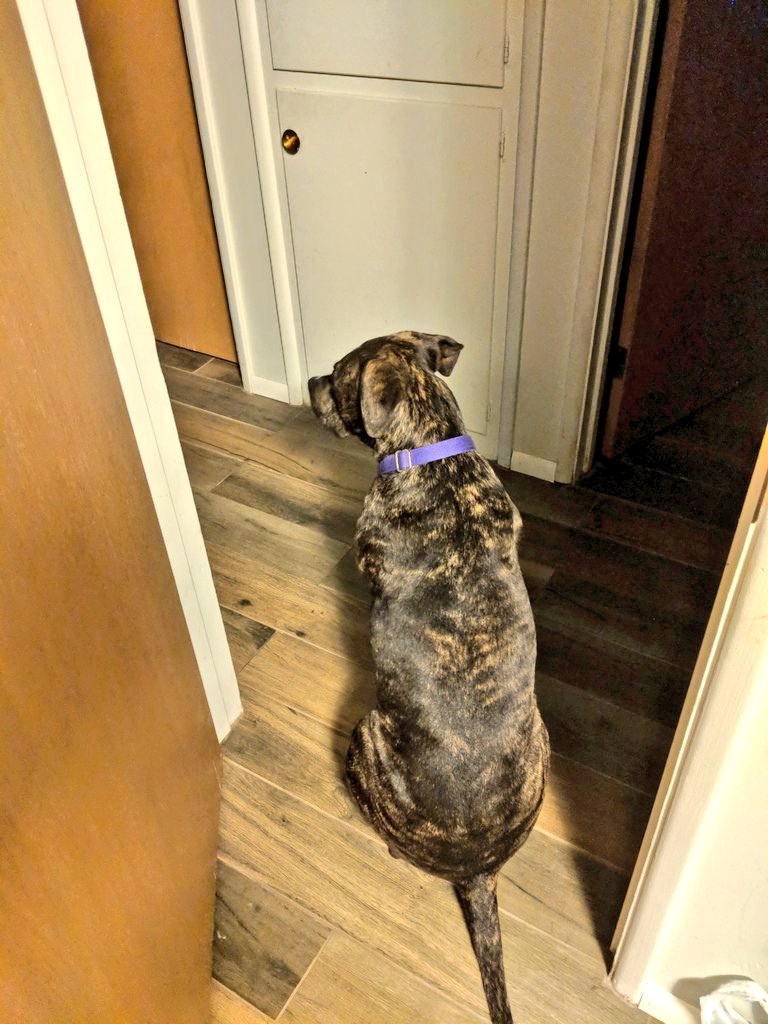 Bumble keeps watch outside my bedroom door when I'm changing. We don't deserve these creatures.