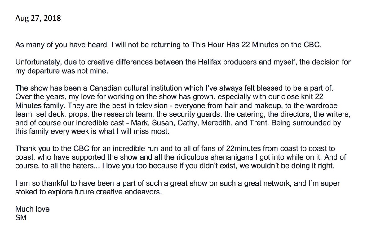 22 Minutes was my first full-on TV gig. I showed up in Halifax not knowing anyone and feeling very intimidated. The kindness and support Shaun showed me from the get-go made all the difference. Congrats on a truly excellent run. Can’t wait to see what comes next.https://twitter.com/shaunmajumder/status/1034080699211558914 …