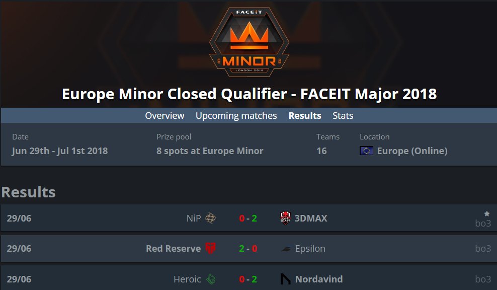 #FACEITMJR EU minor closed qualifier For more details: https://www.hltv.org/results?event=3732 …pic.twitter.com/B4iU8BmrFS
