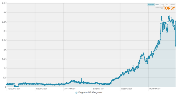 Profile of a social media phenomenon. Minute by minute tweets about #Ferguson in the last 12 hours.pic.twitter.com/RnZ67BdxDl