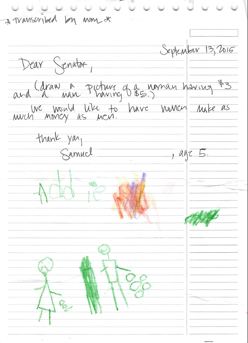 Samuel is 5 years old and he sent a letter to Sen. Murray calling for #EqualPayNow!pic.twitter.com/0y8WrQ7KGY