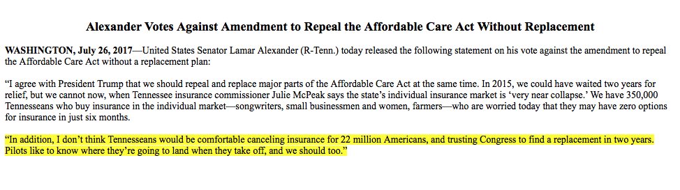 Thank you Senator Alexander. With all due respect, the GOP had SEVEN YEARS to come up w/ a plan, repeal/replace "later" is not a plan.