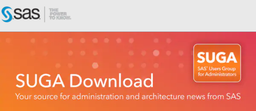 Sign up for the SUGA Download newsletter. You’ll find helpful articles for SAS administrators, best practices to manage your software, plus info on upcoming releases, webinars and training. Join now!