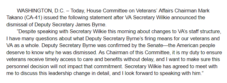 @RepMarkTakano statement on VA Dep Sec Byrne's firing: "The American people deserve to know why he was dismissed."pic.twitter.com/Oc3J5oNjeO