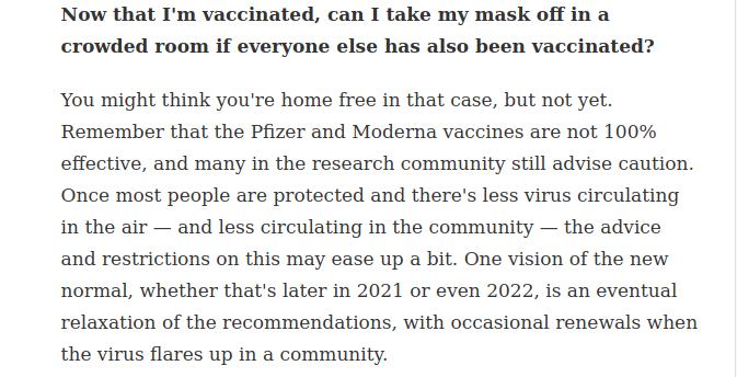 Yes, agree with headline, for now. But the message to those considering vaccination should emphatically be: 1. Protects you! 2. Protects others! Focusing on no "proof" of #2 in the data needs to stop. Broad use of these vaccines will reduce transmission.https://www.npr.org/sections/health-shots/2021/01/12/956051995/why-you-should-still-wear-a-mask-and-avoid-crowds-after-getting-the-covid-19-vac …