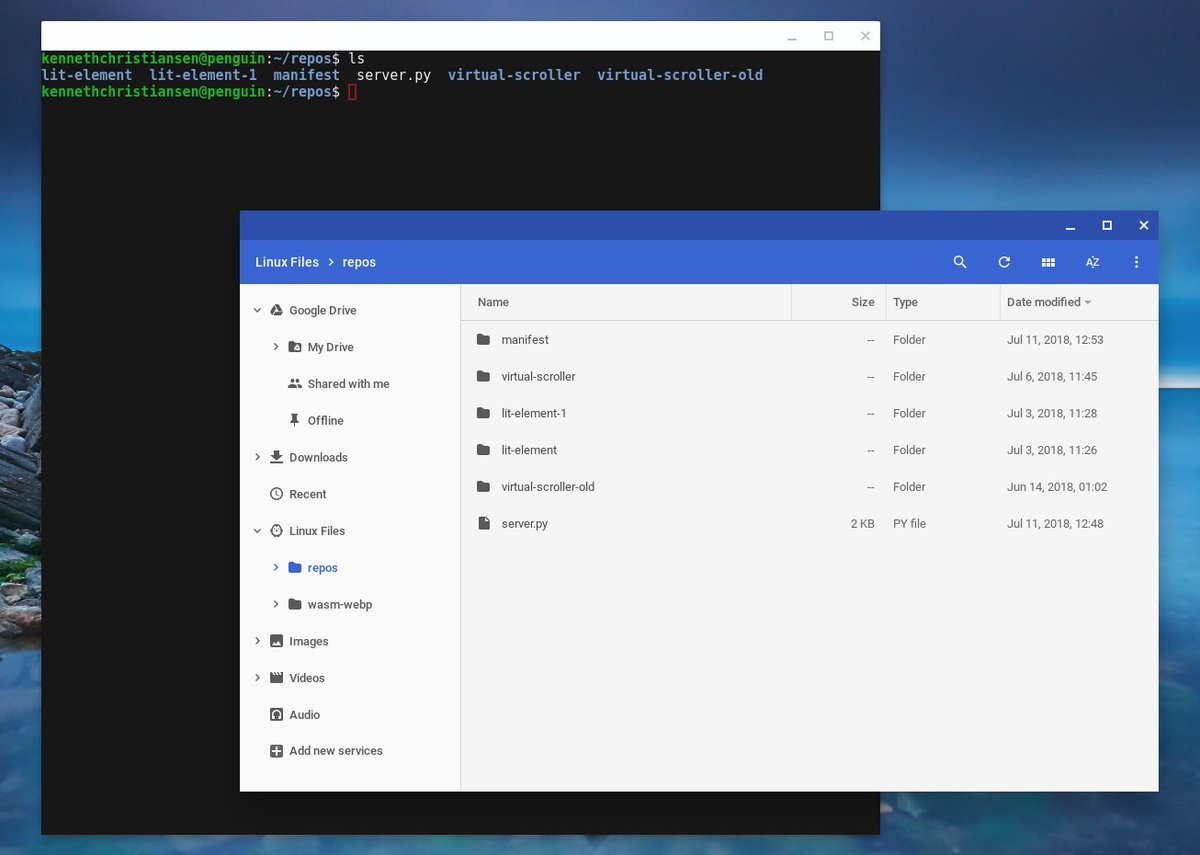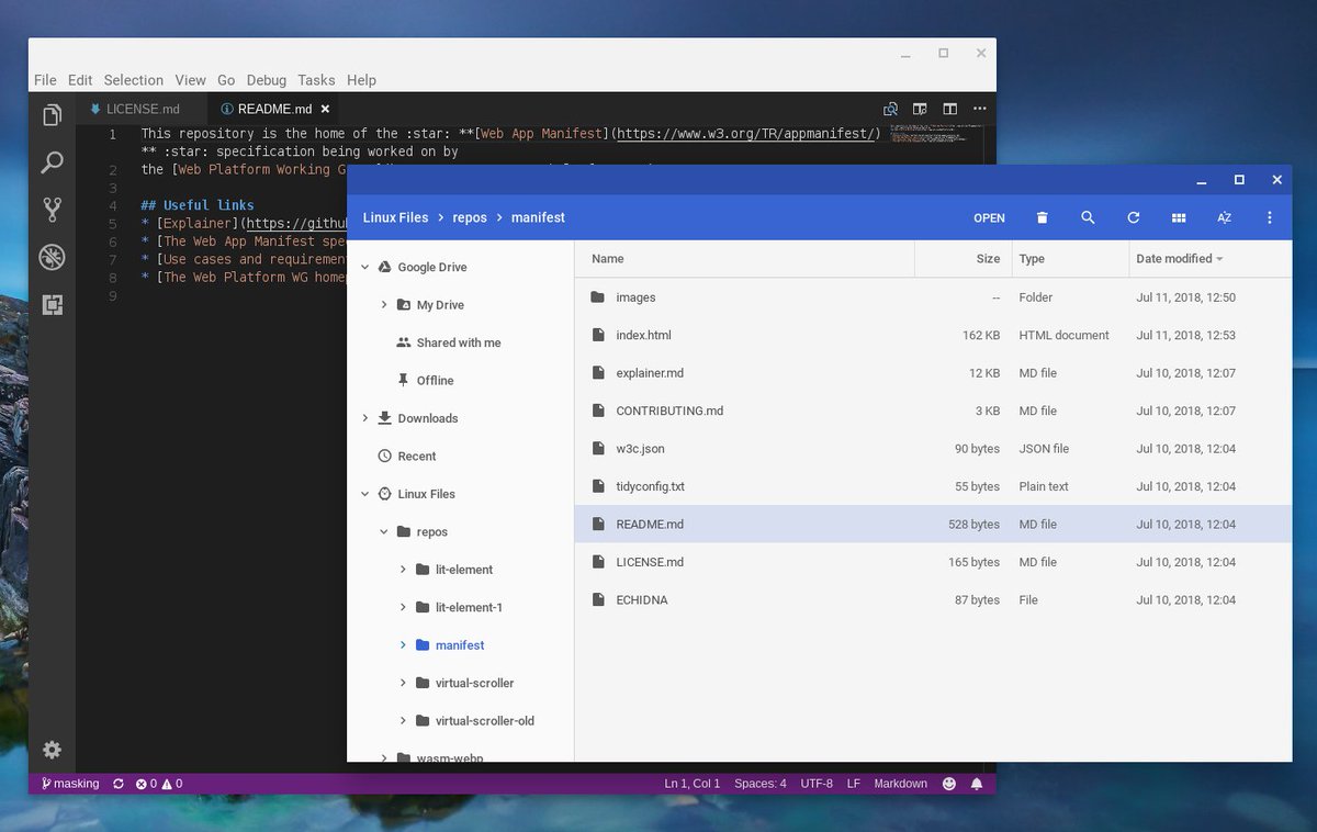 Linux support gets better and better on Chrome OS! Now I can access my Linux files in the file manager! and clicking on an .md file just opened it in