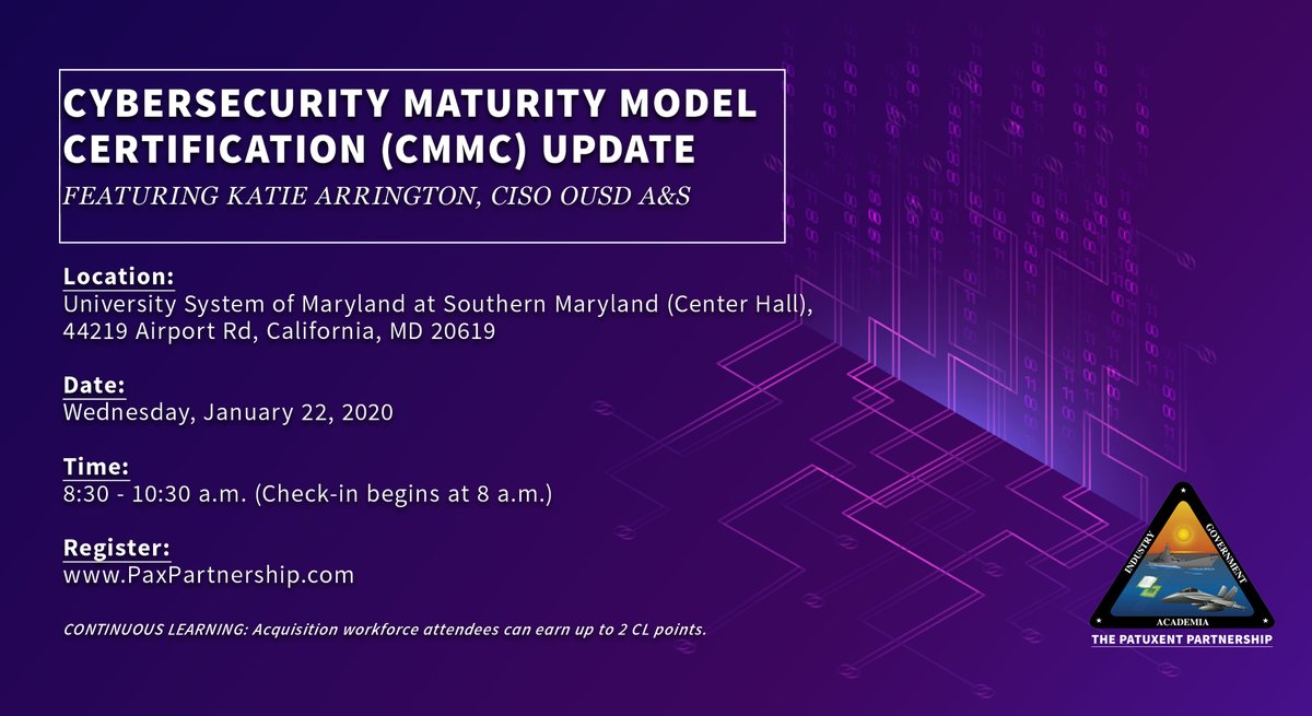 Registration for CYBERSECURITY MATURITY MODEL CERTIFICATION (CMMC) UPDATE FEATURING KATIE ARRINGTON, CISO OUSD A&S is open! For full details and to register for this program, visit http://bit.ly/2r6jef3