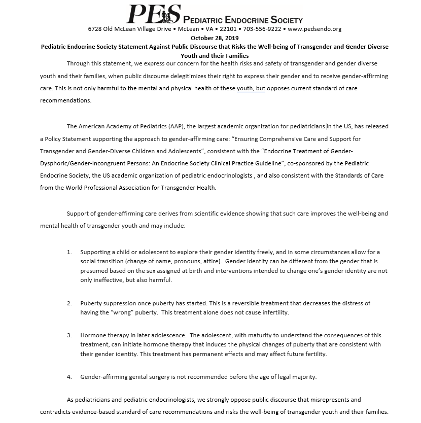 Pediatric Endocrine Society Statement Against Public Discourse that Risks the Well-being of Transgender and Gender Diverse Youth and their Familiespic.twitter.com/9XTDKZ8MCK