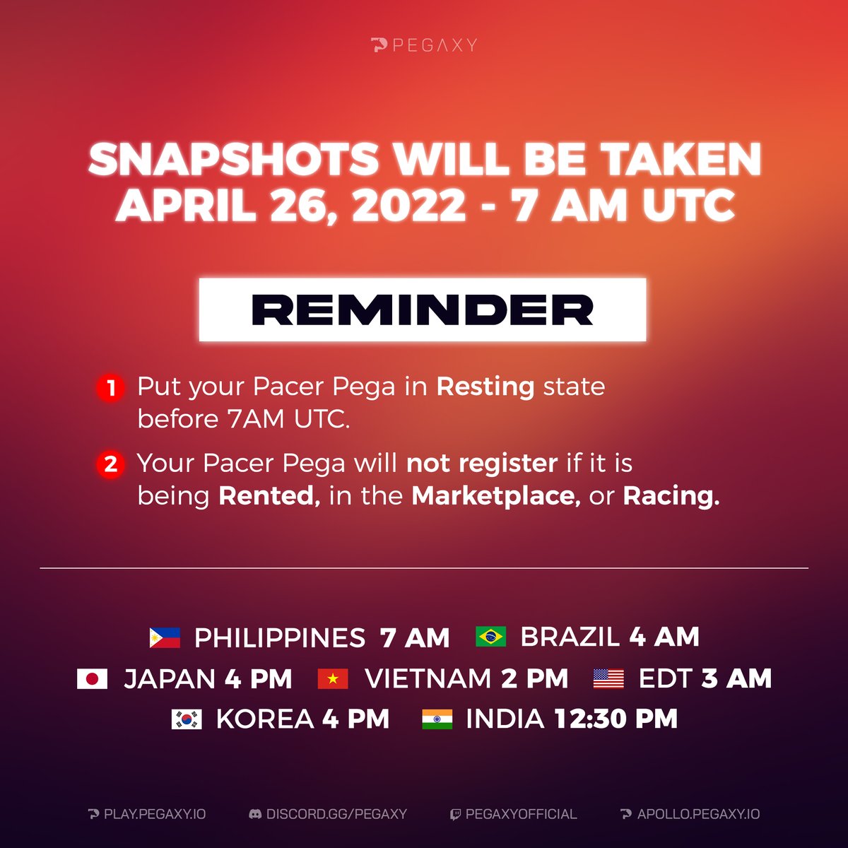 Ensure at least 1 of your Pega is in resting mode inside your wallet at the time outlined in the graphic! Don't miss out.