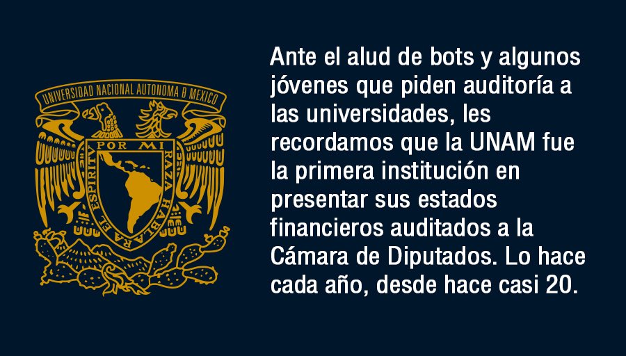 Ante el alud de bots y algunos jóvenes que piden auditoría a las universidades, les recordamos que la UNAM fue la primera institución en presentar sus estados financieros auditados a la Cámara de Diputados. Lo hace cada año, desde hace casi 20.pic.twitter.com/qOMSRJkjvR