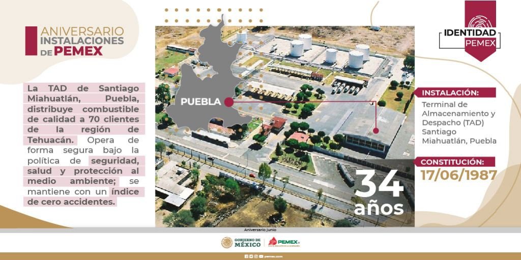 #IdentidadPemex Ubicada en el estado de Puebla, la Terminal de Almacenamiento y Despacho (TAD) Santiago Miahuatlán hoy cumple 34 años de servicio.#PorElRescateDeLaSoberaníapic.twitter.com/2NVrCFzvaZ