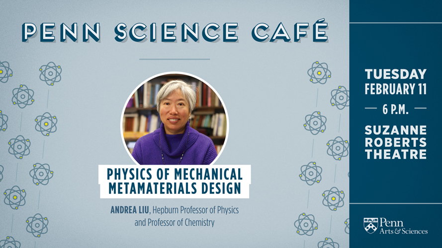 #ScienceCafe! Andrea Liu will be at the#SuzanneRobertsTheatre to talk about discovering new principles, allowing design of metamaterials. https://bit.ly/37XShKx@Penn@CollegeAtPenn@pennphys@PennChemistry@avenueofthearts@TheFranklin@PhilaTheatreCopic.twitter.com/THGeiuq2og