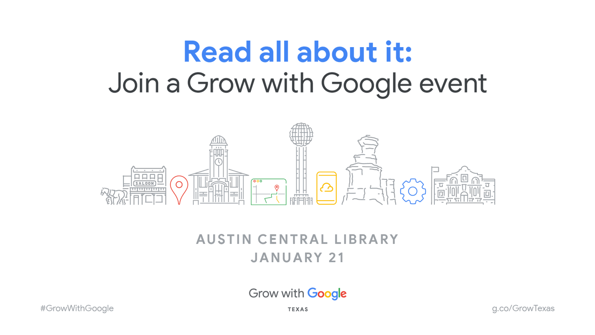 @Google and welcome#GrowWithGoogle to#Texas. Join us at the Austin Central Library to grow your skills, career or business on January 21st. Register for the free event: http://g.co/GrowTexas pic.twitter.com/49gHxhjdRp