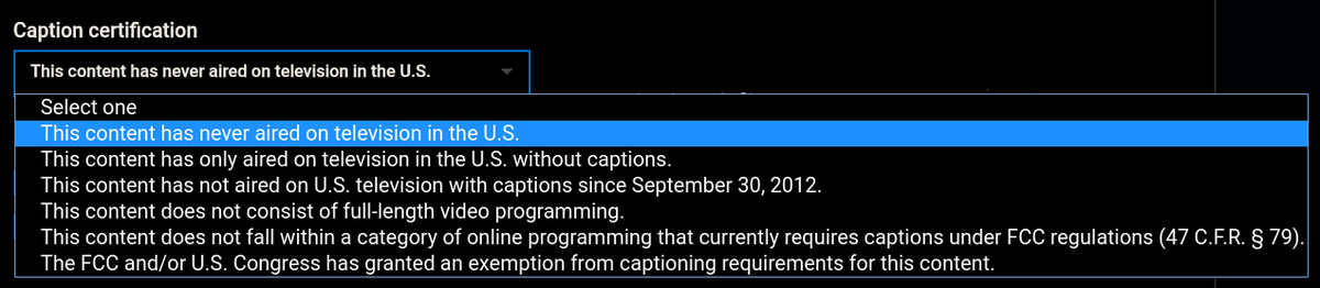 While uploading a video, I'm just now realizing what this box means Hey @TeamYouTube can you please work on accessibility features for people who are Hard of Hearing or d/Deaf instead of giving people like 6 options to excuse themselves from letting us watch their videos? thx <3pic.twitter.com/LcHeF4dXRN