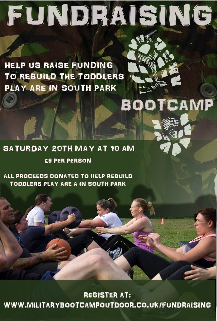Join in a Fundraising Bootcamp this Saturday (20 May) to help rebuild the South Park toddler play area - see poster for more detailspic.twitter.com/7e8S8jPtdC