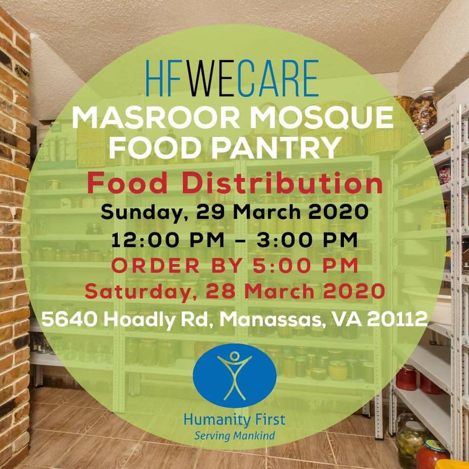 For anyone running low on food, we have some local heroes who can help you out. The Masroor Mosque chapter of the Ahmadiyya Muslim Community is setting up a temporary food pantry in Manassas. Please register here: https://usa.humanityfirst.org/masroor-mosque-food-pantry/ …