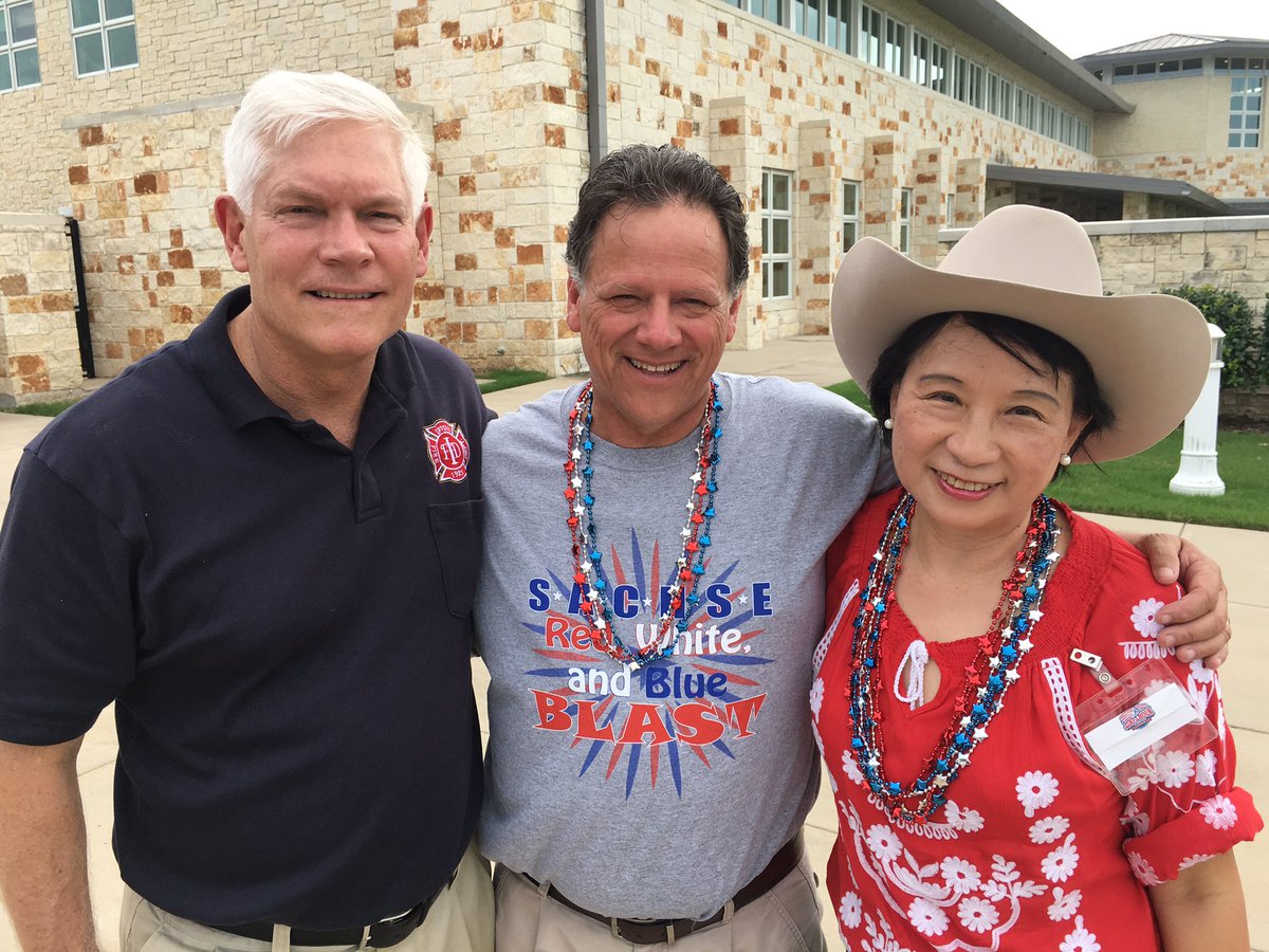 Great night with Mayor Mike Felix and State Rep Angie Chen-Button before the Sachse Red White and Blue Blast.