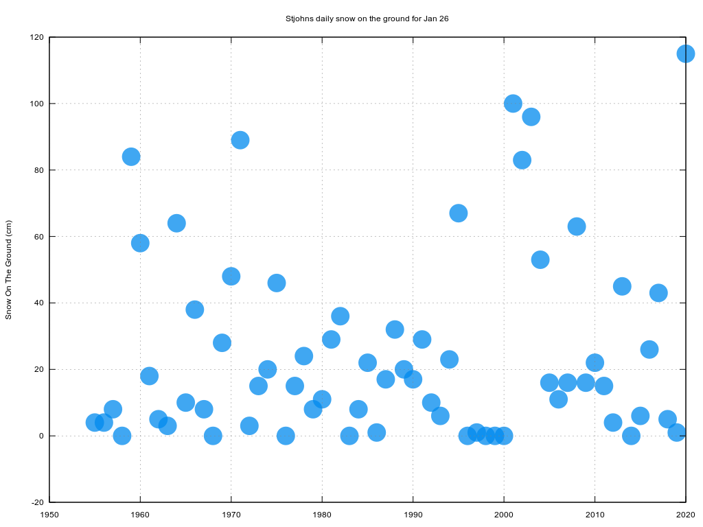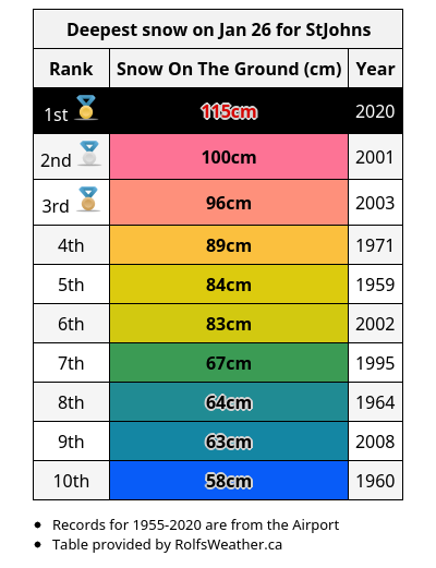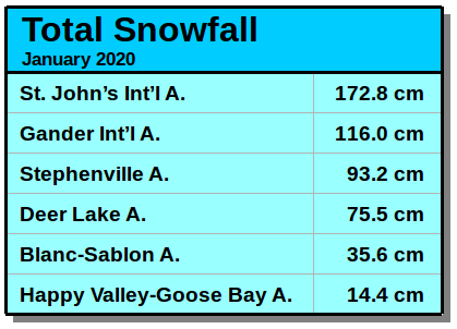 #YYT now behind us: total 172.8 cm. (Old rec 164.8 cm, 2005). Contrast with second-lowest January snowfall total on record for Happy Valley-Goose Bay#YYR: 14.4 cm. (Rec 10.9 cm, 1942, holds). Records began in 1942 at both sites.#nlwxpic.twitter.com/YAGz5Wm5jO