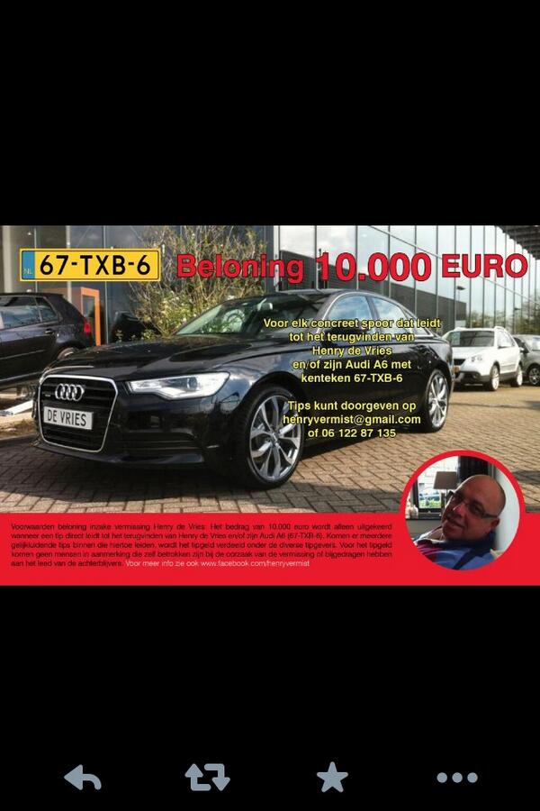 @PeterRdeV:beloning van 10.000 euro zaak van vermiste#HenrydeVries. Wie weet waar hij of zijn auto is? Help mee! pic.twitter.com/9qHtA2VTTp”