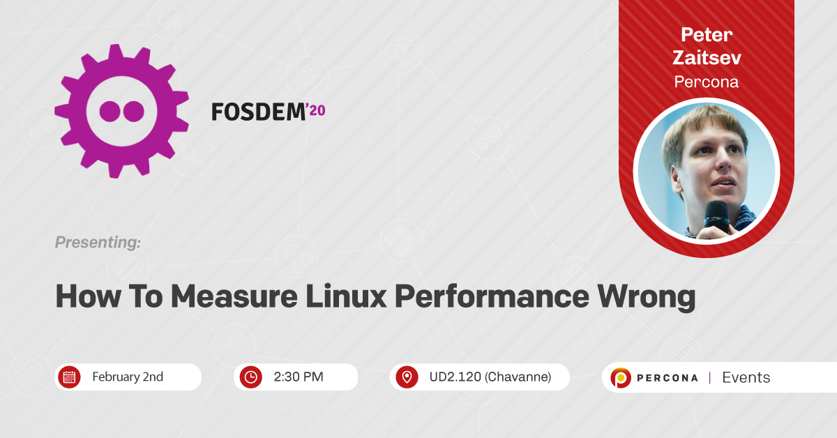 #FOSDEM on Sunday, Feb 2? Come to the Monitoring and Оbservability devroom.@PeterZaitsev,@Percona CEO, is presenting "How to Measure#Linux#Performance Wrong" talk at 2:30 PM in room UD2.120 (Chavanne).#FOSDEM2020#opensourcepic.twitter.com/T0YZ2w7eBi