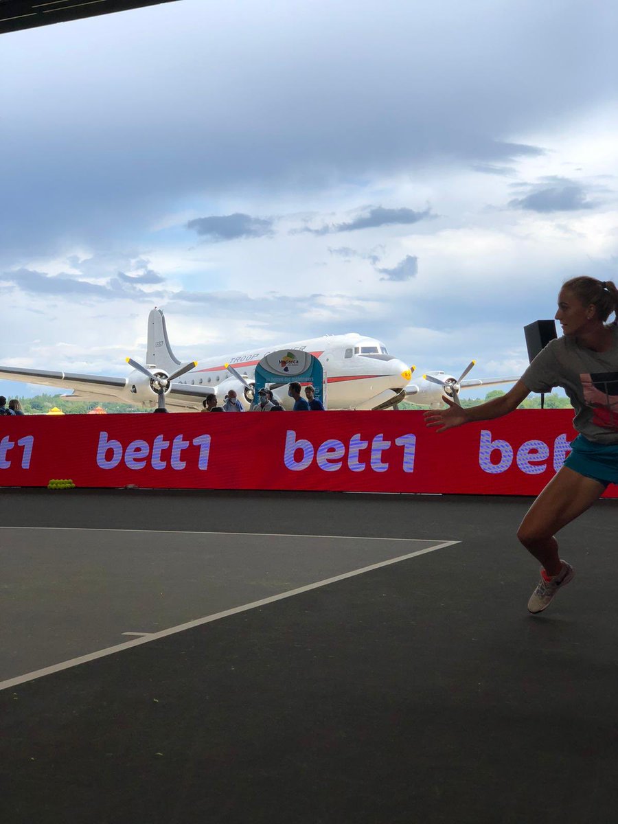 Definitely a first time for everything! The hard court in Berlin is inside an airport hangar. Will try not to hit the plane