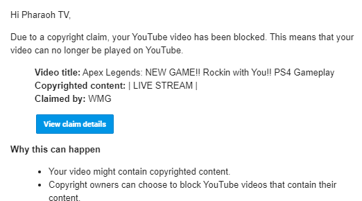 @TeamYouTube So WMG or #WarnerMusicGroup Just decided to Copyright 3 Old Live streams of #ApexLegends and they Blocked my Videos world wide. No music was playing at all. it would be great if you could Support & protect us Creators from stuff like this @warnermusicpic.twitter.com/OlKD5NV7w8