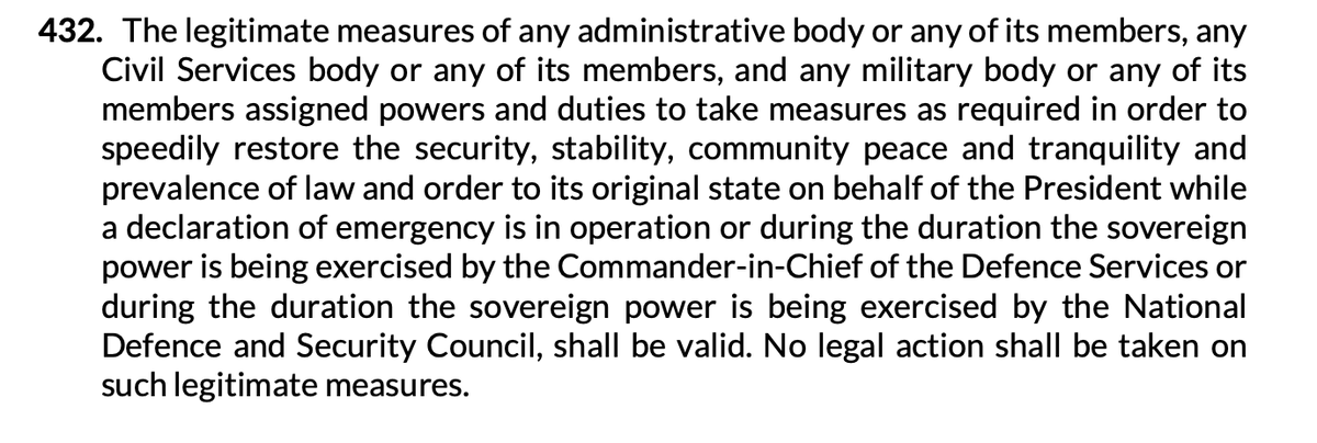 #Myanmar: Art. 432 of the Constitution cements impunity for measures taken pursuant to the state of emergency - all measures "shall be valid" & "no legal action" may be taken, contrary to the rule of law (courts cannot review measures & victims of violations cannot seek redress)pic.twitter.com/GmveAmEi19