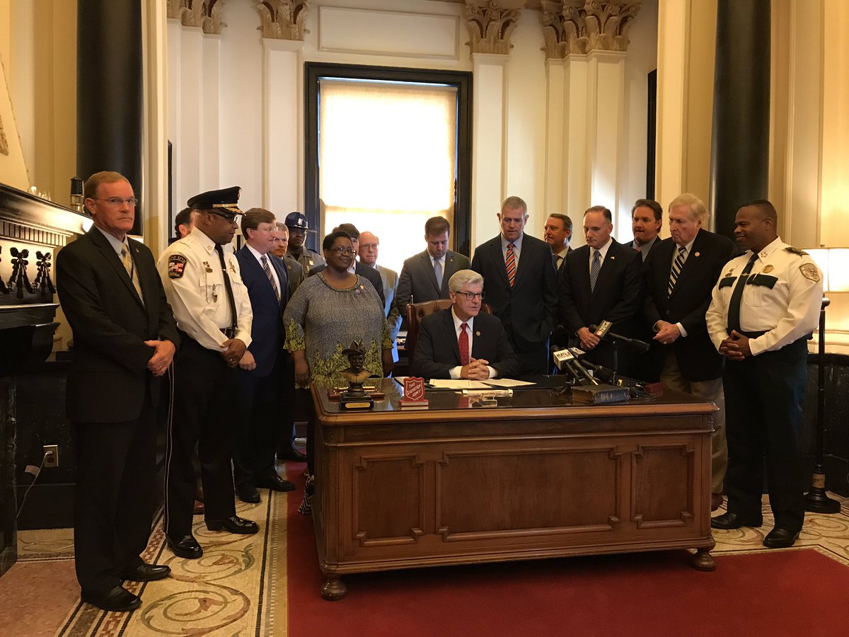 MS. Gov. Phil Bryant signs bills including Criminal Justice Reform. Act. He’s flanked here by law enforcement and legislators who supported reform.