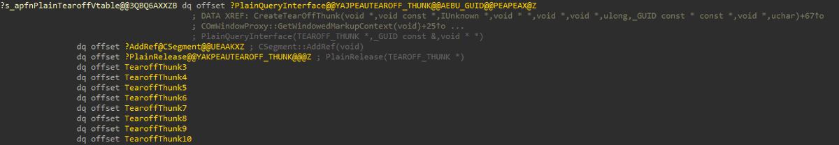 Random question time: Does anyone know what the various "TearoffThunk" vtables in mshtml.dll are supposed to do? From my extremely brief analysis, it seems like they might be used as proxies for a few COM interfaces, but any further information would be much appreciated.pic.twitter.com/UTYOYDdrxo