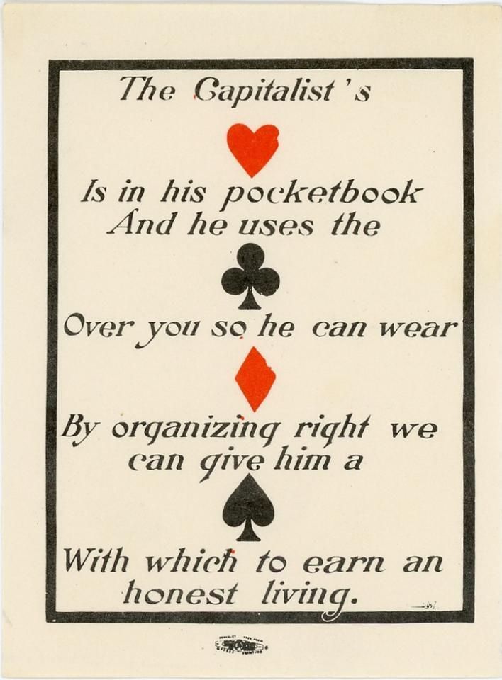 "The capitalist's [heart] is in his pocketbook, and he uses the [club] over you so he can wear [diamonds]. By organizing right we can give him a [spade] with which to earn an honest living." (Industrial Workers of the World, 1920)pic.twitter.com/pDgp7UbwIf