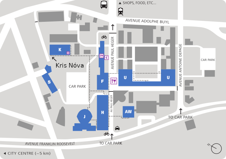 There are free shuttle busses driving to Brussels South station (midi), departing in front of the AW building (see signage) roughly every 20 min.