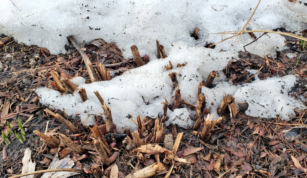 Wow, Bimble G., you're North of Chicagoland though moderated by water. Are those Itoh Peonies w/ buds up on the stem? A legacy from their Tree Peony heritage. Here's my Itoh 'Bartzella' snug at the moment, with all our melt-offs, surprised visible buds aren't larger.