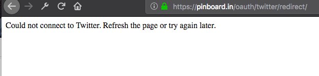 @Pinboard I’m getting this when trying to connect a Twitter account. Was the same a couple of days ago. Should I do something different? :)pic.twitter.com/XY0QYb90cM