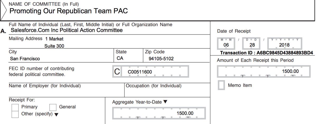 Here's Salesforce on June 28 making a $1500 donation to Promoting Our Republican Team PAC. The money is funnelled directly to a half-dozen Republican Senate candidates in competitive races. http://docquery.fec.gov/pdf/152/201807249119313152/201807249119313152.pdf …pic.twitter.com/QZWOuto3Lv