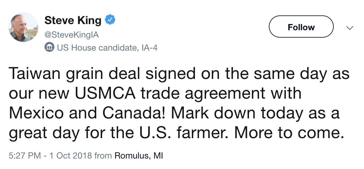 The Taiwan deal is an attempt to mitigate Trump's tariff policy, which has been a disaster for Iowa farmers. But I take the unusual tweeting about grain rather than race purity as a sign that Steve King is getting nervous (though not nervous enough to be in his district)pic.twitter.com/TlTF8u6Jrl