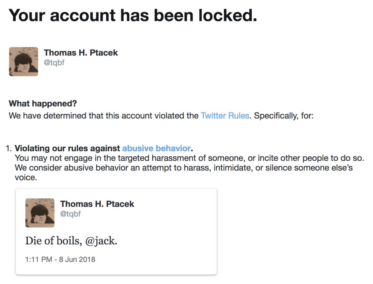 What we know so far: not okay to tell @jack to die of boils (though this is advice he should follow)—@aodespair and @tqbf both got banned for that. Perfectly fine, apparently, to tell someone to die in a fire.pic.twitter.com/0MLvoTy8K8