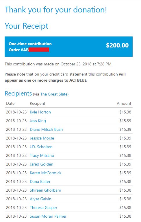 Donated $250 to the Great Slate, $50 to ActBlue (not sure if that part is included in your match?). Sending receipt via DM. Thanks for your hard work and inspiration!