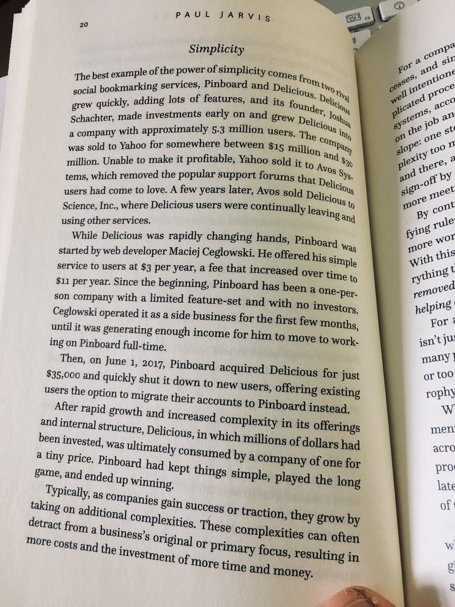 📖 3rd day reading @pjrvs' "Company of One." Love this story: Delicious: - Launched in 2003 - $2 million in funding - Sold to Yahoo in 2005 (for ~$15 million) @Pinboard: - Launched in 2009 - Bootstrapped (with yearly plans for users) - Acquired Delicious in 2017 for $35,000! 😮pic.twitter.com/8CiOmS6IuQ