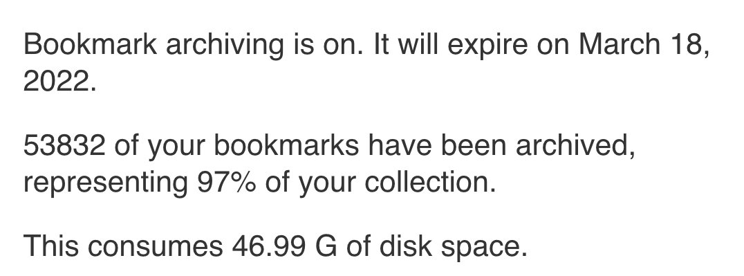 I’m at ~50GB, guess it’s time to look for alternatives soon? https://twitter.com/Pinboard/status/1107711264510210049 …pic.twitter.com/Puy9JJ7vLK