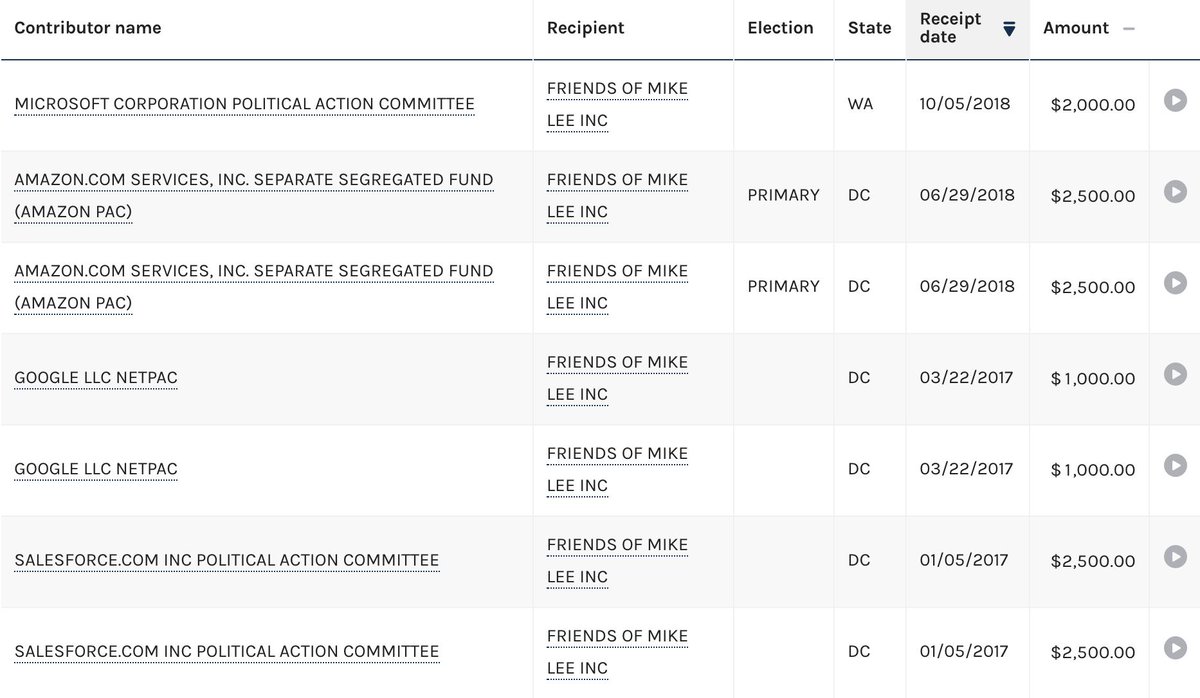 The second senator placing a hold on compensation to 9/11 first responders, Mike Lee of Utah, received large campaign donations from Microsoft, Salesforce, Google, and Amazon.pic.twitter.com/GF6gqnJwWe