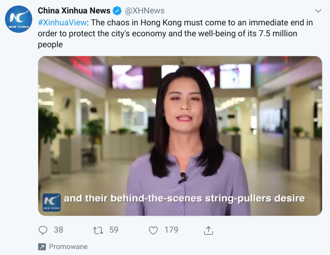Thanks, Twitter, for showing me a promoted tweet by a Chinese propaganda agency spreading disinformation about the situation in Hong Kongpic.twitter.com/hHdEWFAPw5