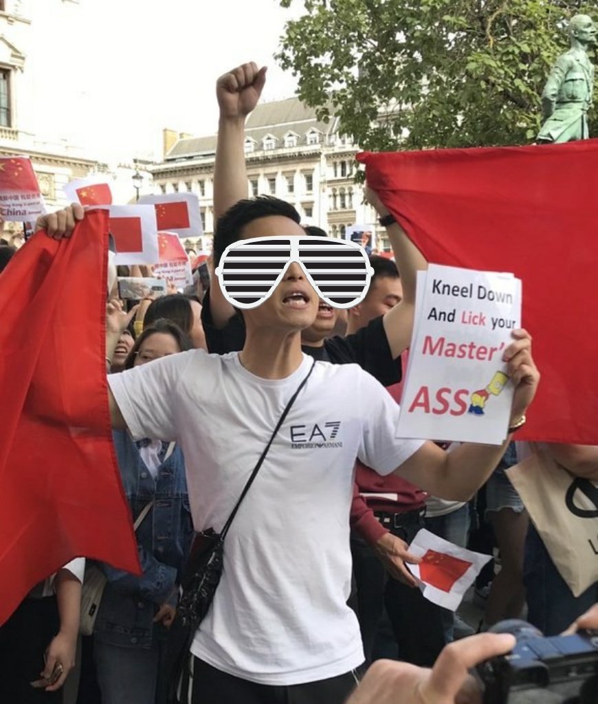 As seen in a #HongKongProtests rally in Australia. Pitifully aggressive and pointless slogan hoisted by a pro-CCP supporter. Covering up this person's face both for privacy and not helping him get his 2 seconds of fame on the internet. #FreedomHK #BeWater #StandWithHKpic.twitter.com/MGsqgP97lm