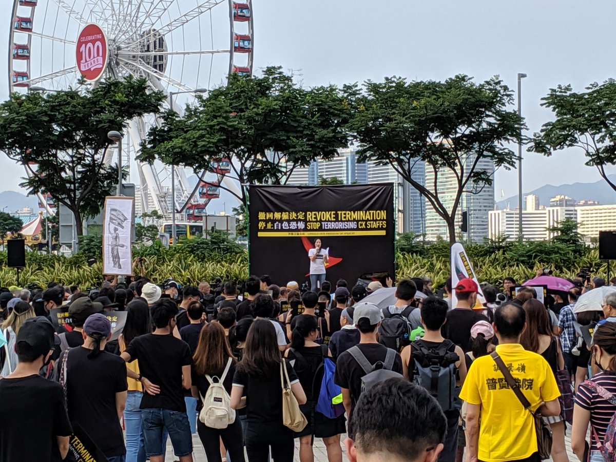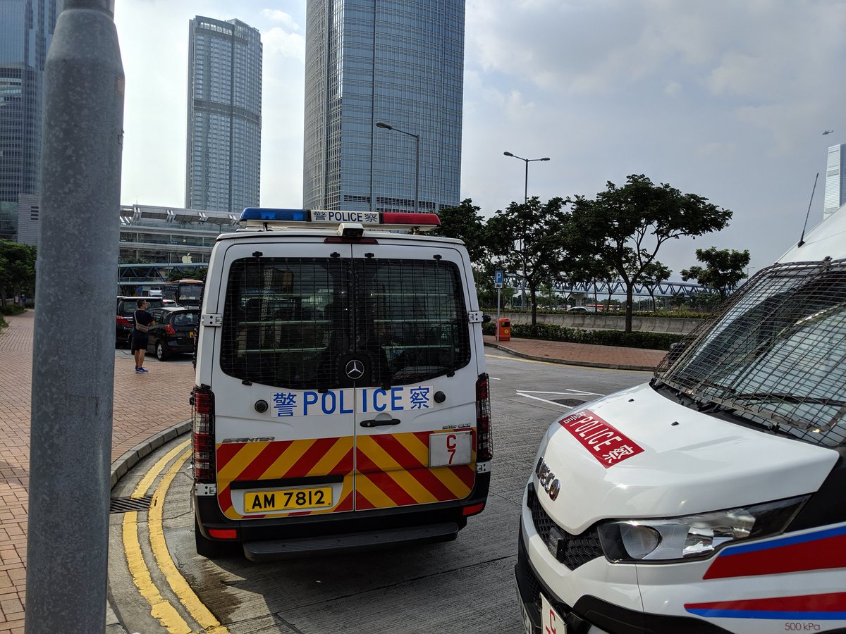 At the rally in support of fired Cathay Pacific employees. Police are hiding in their idling van, which they've parked prominently at the head of the rallypic.twitter.com/FfqpbwqIFX