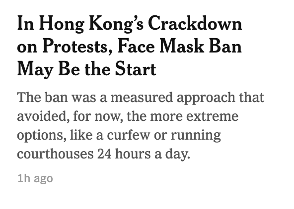 The article itself is well worth your time. But the blurb and headline are what most people will read. https://www.nytimes.com/2019/10/06/world/asia/hong-kong-protests-face-mask-ban.html …