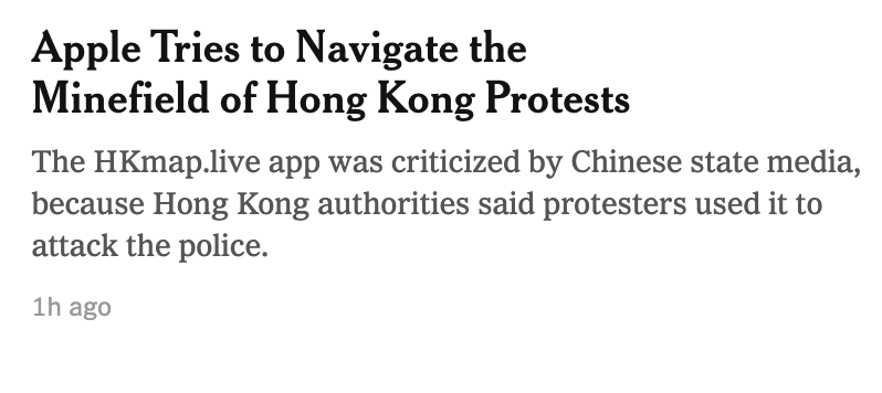 Another example of an almost wilfully deceptive headline from the New York Times, which seems to be bending over backwards to not offend with its Hong Kong coverage. Apple isn't navigating a minefield, it censored a legal user safety app at China's request, and lied about why.pic.twitter.com/OgqrRVkqIw